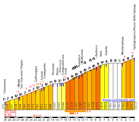Net als de andere etappes aan de noord-oostkant is dit een heen-en-weertje. We rijden vanuit Sorico pal naar het noorden. Gelukkig kunnen we de drukke wegen vrijwel geheel vermijden. Tot Chiavenna is de route zo goed als vlak, maar dan begint het klimwerk ook echt. Bijna 1800 hoogtemeters in 30 km. Deze pas mocht optreden in de Giro van 1965.